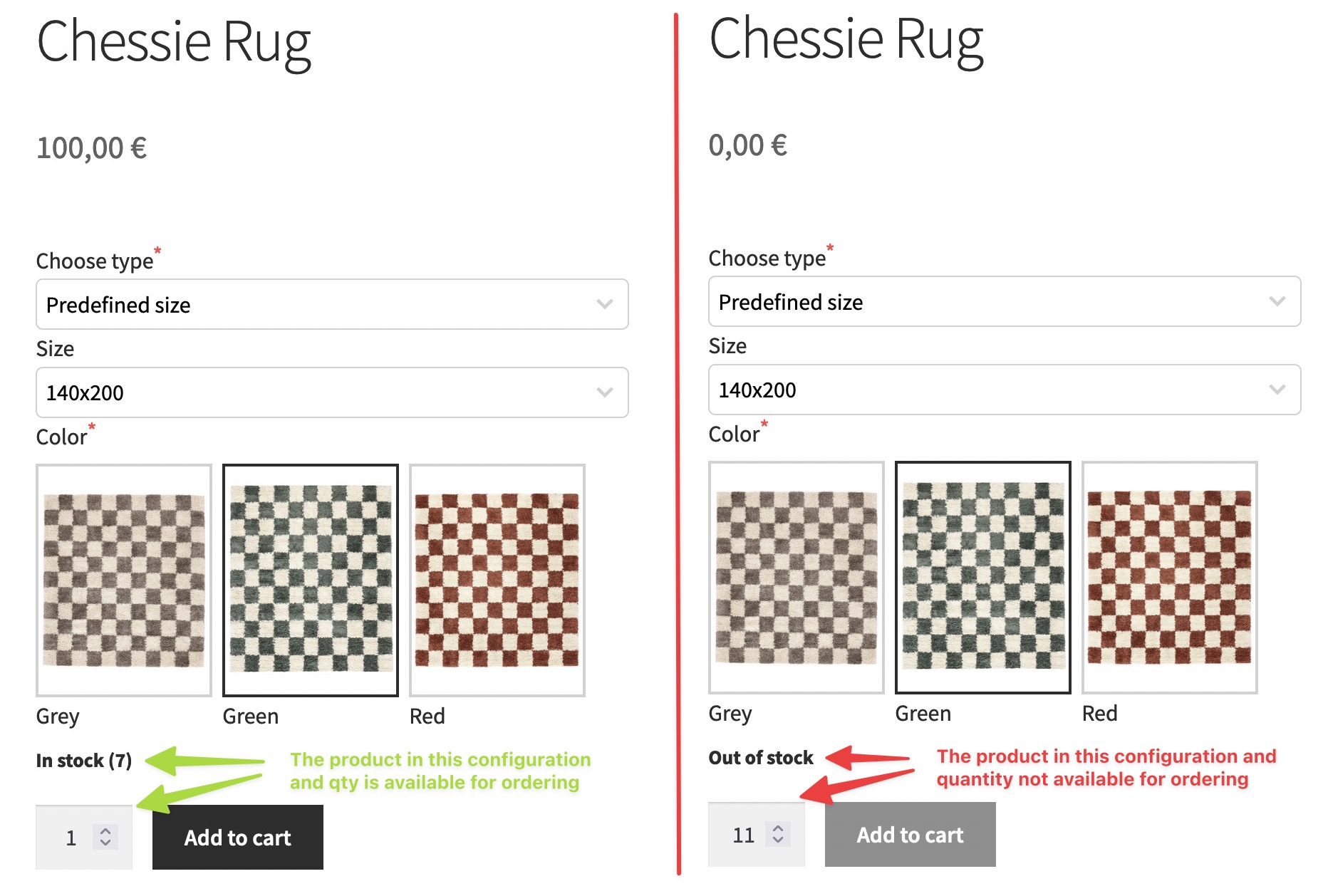 It is possible to notify customers about stock availability of the specific configuration of the product. This is how it may look like: